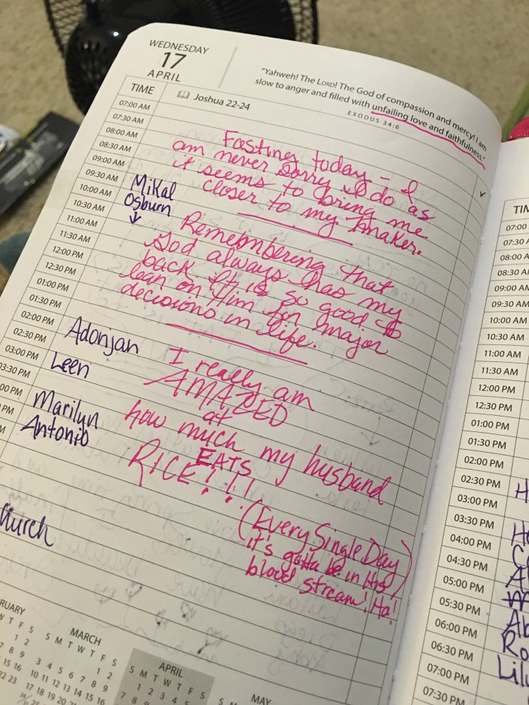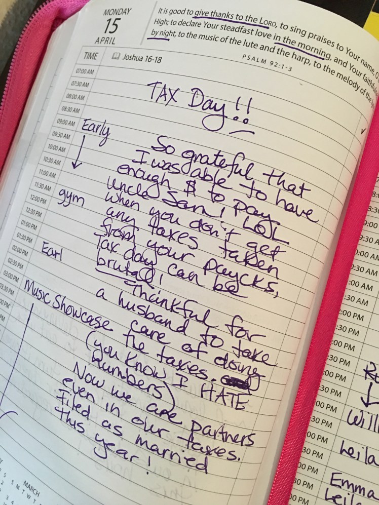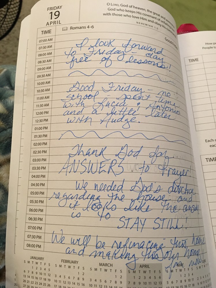 I ran across a friend of mine who was using the One Line A Day five year journal. It seems to be a cool concept. You write one line (or maybe a few) everyday for a year. The next year you go back to the same page of the last year and write more lines and so forth. So that eventually you see a sum up of 5 years on each page! So maybe I can find the energy to write one line a day! I do have a scheduling calendar I use to keep up with all of my students, so I thought, why not just use that. Then my people can even see how my day unfolds.